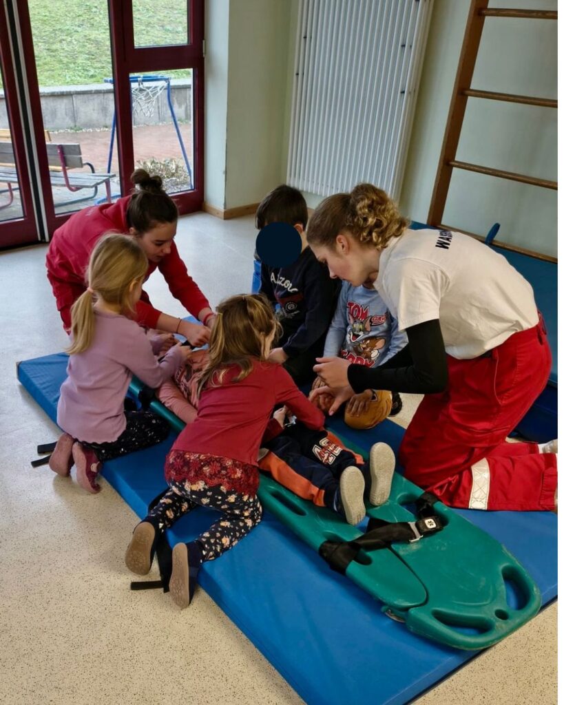 Ein besonderes Highlight war für die Kinder unsere Ausrüstung. Wir hatten verschiedene Hilfsmittel mitgebracht, die bei Einsätzen verwendet werden. Natürlich durften die Kinder alles ganz genau anschauen und auch selbst ausprobieren – vom Anlegen einer Rettungsweste bis hin zum Kennenlernen des Kombicarriers.