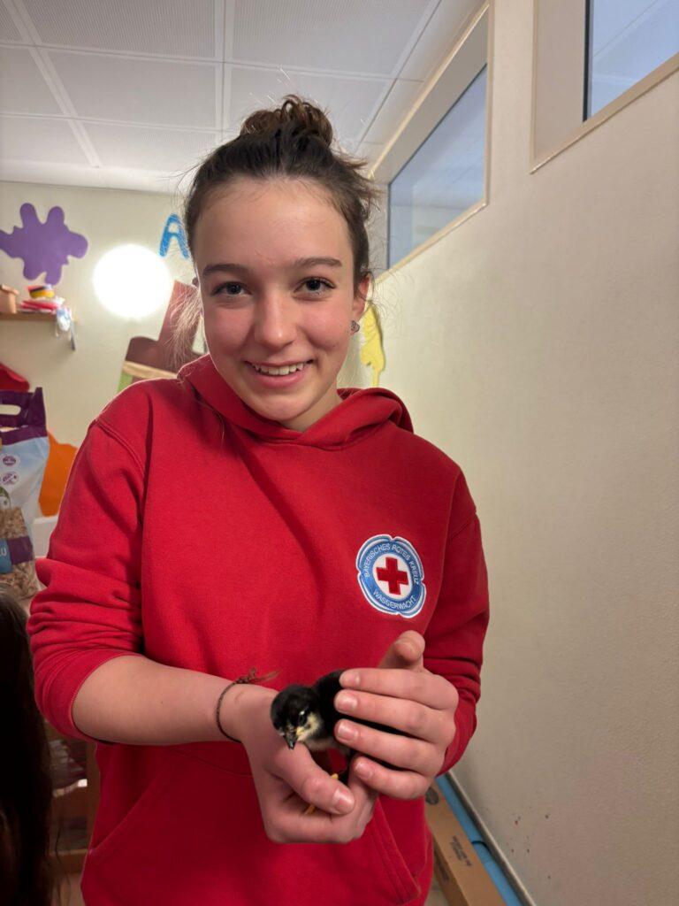 Zum Abschluss wartete dann noch eine schöne Überraschung auf uns: Als Dankeschön durften wir die jungen Hennen des Kindergartens kennenlernen. Die Tiere wurden neugierig begutachtet und auch vorsichtig gestreichelt – ein toller und entspannter Ausklang für einen rundum gelungenen Besuch.